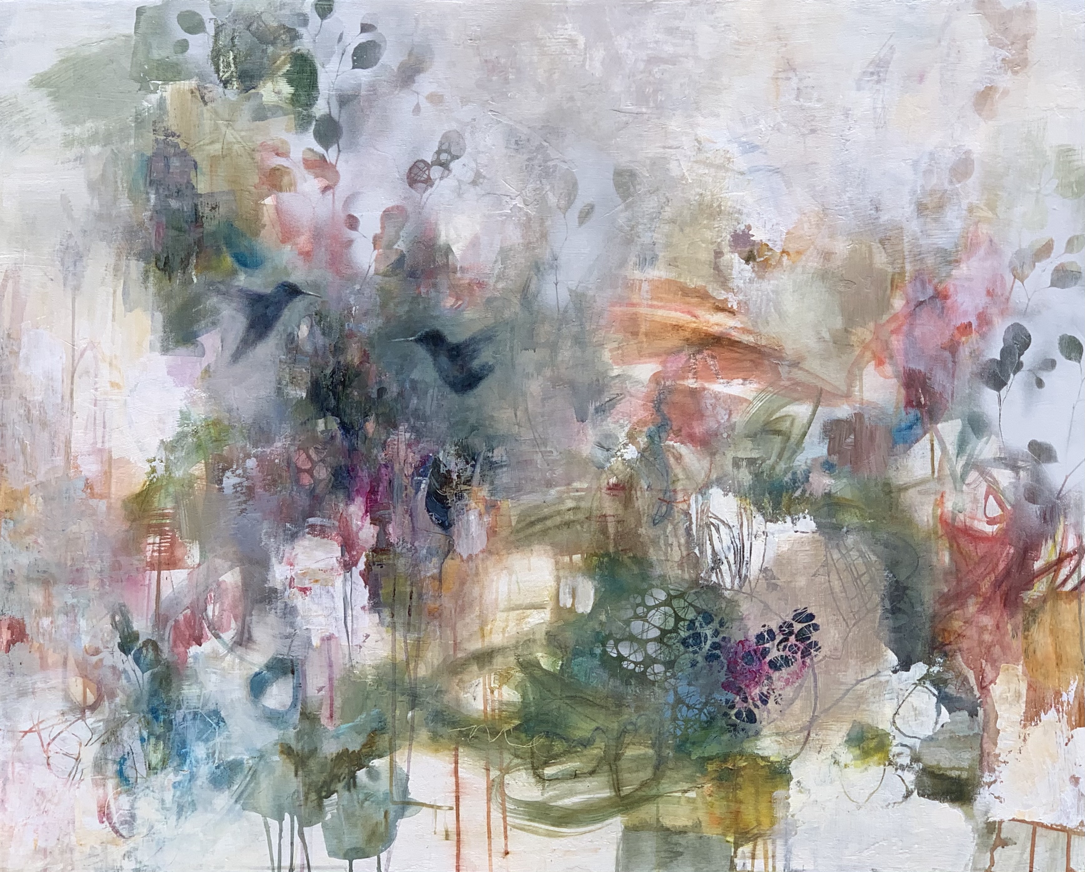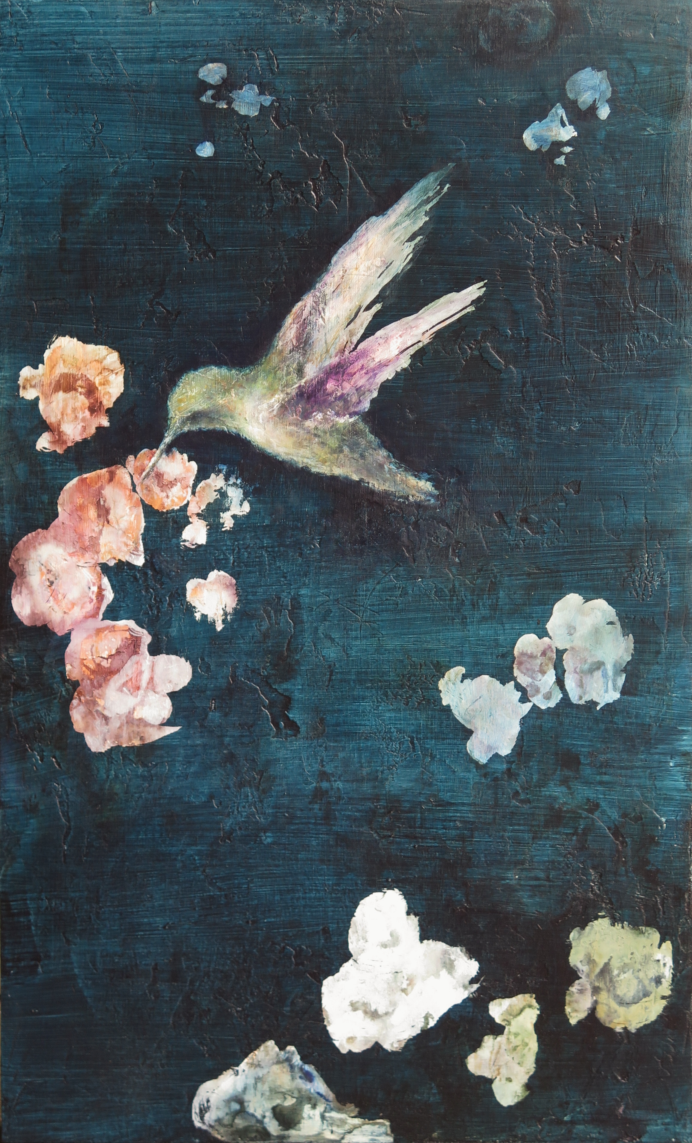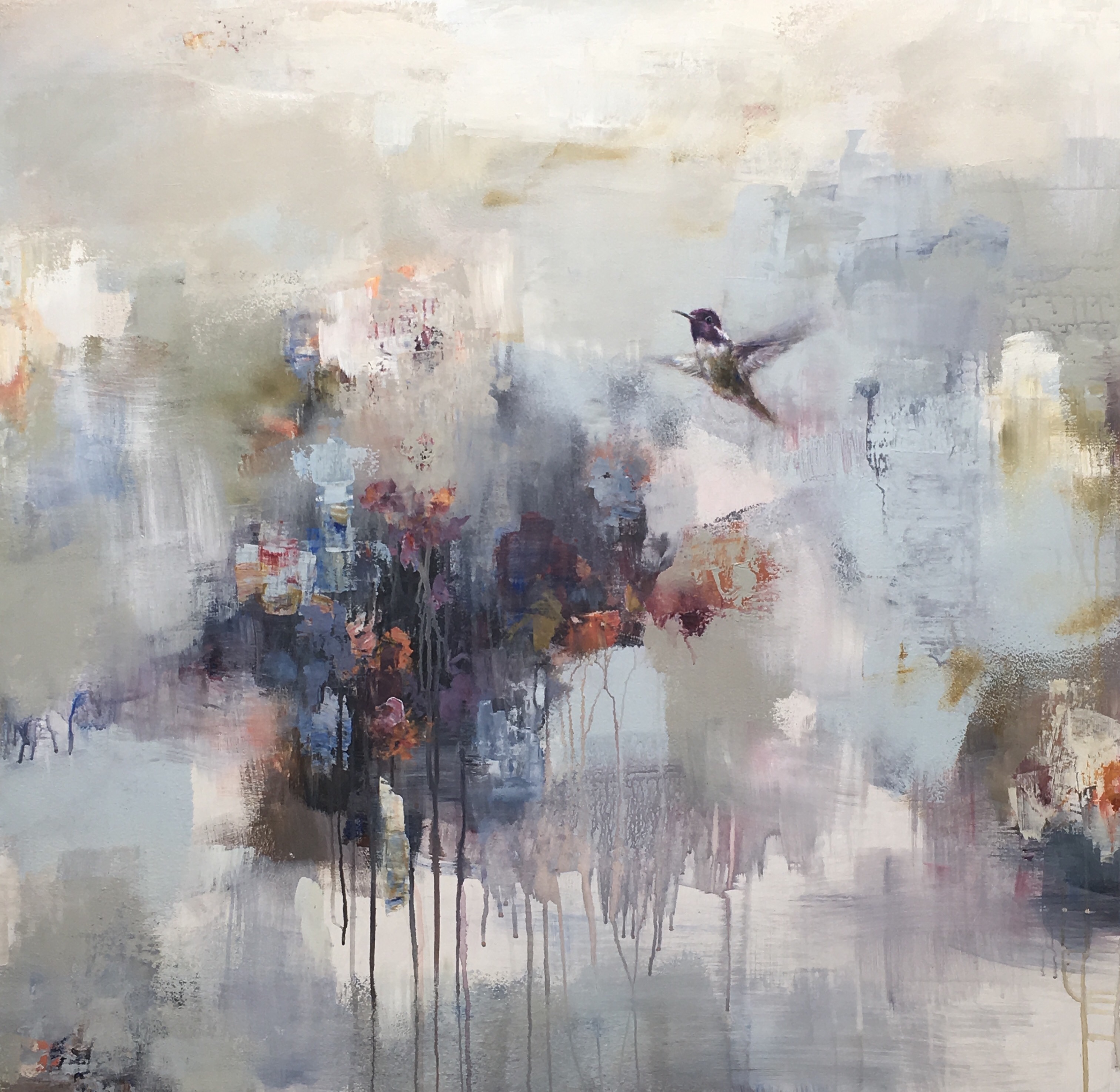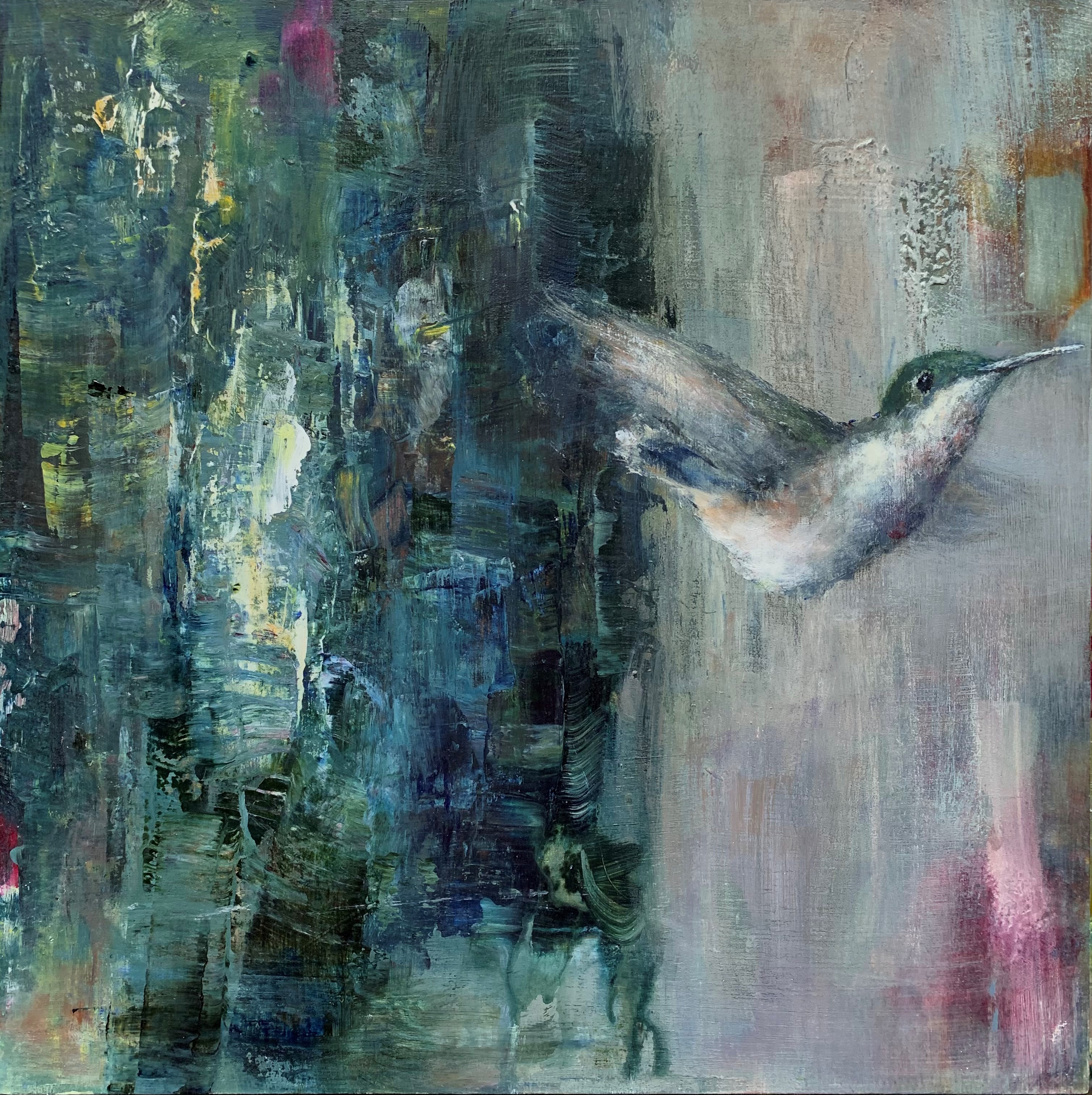 - Atmospheric original contemporary acrylic painting of humingbird by Tracey Lane Atlanta artist