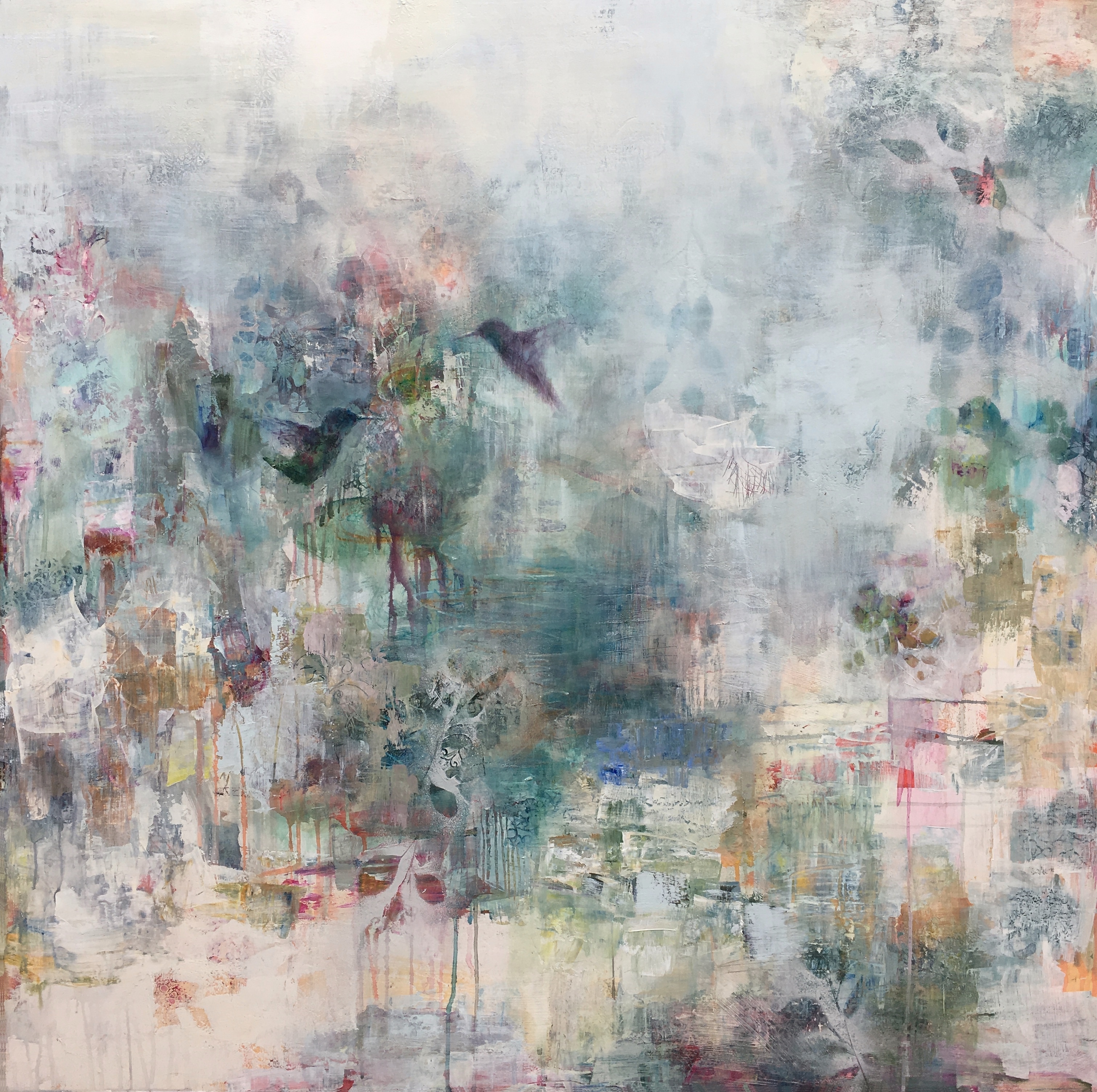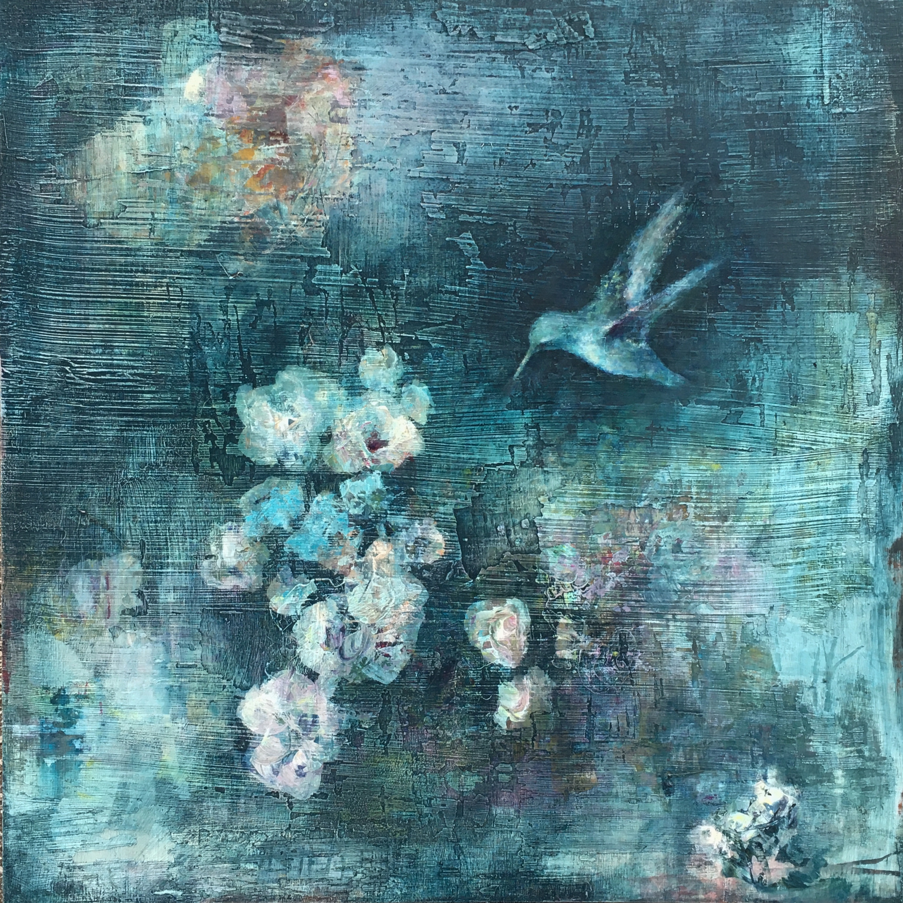 - Atmospheric original contemporary acrylic painting of hummingbird by Tracey Lane Atlanta artist